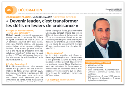 À cette occasion, Mickaël Hamot, Directeur Général de Cromology France, partage sa vision des grandes tendances du marché et les ambitions du groupe dans une interview à découvrir ci-dessous et dans le dernier numéro de Zepros Négoce.